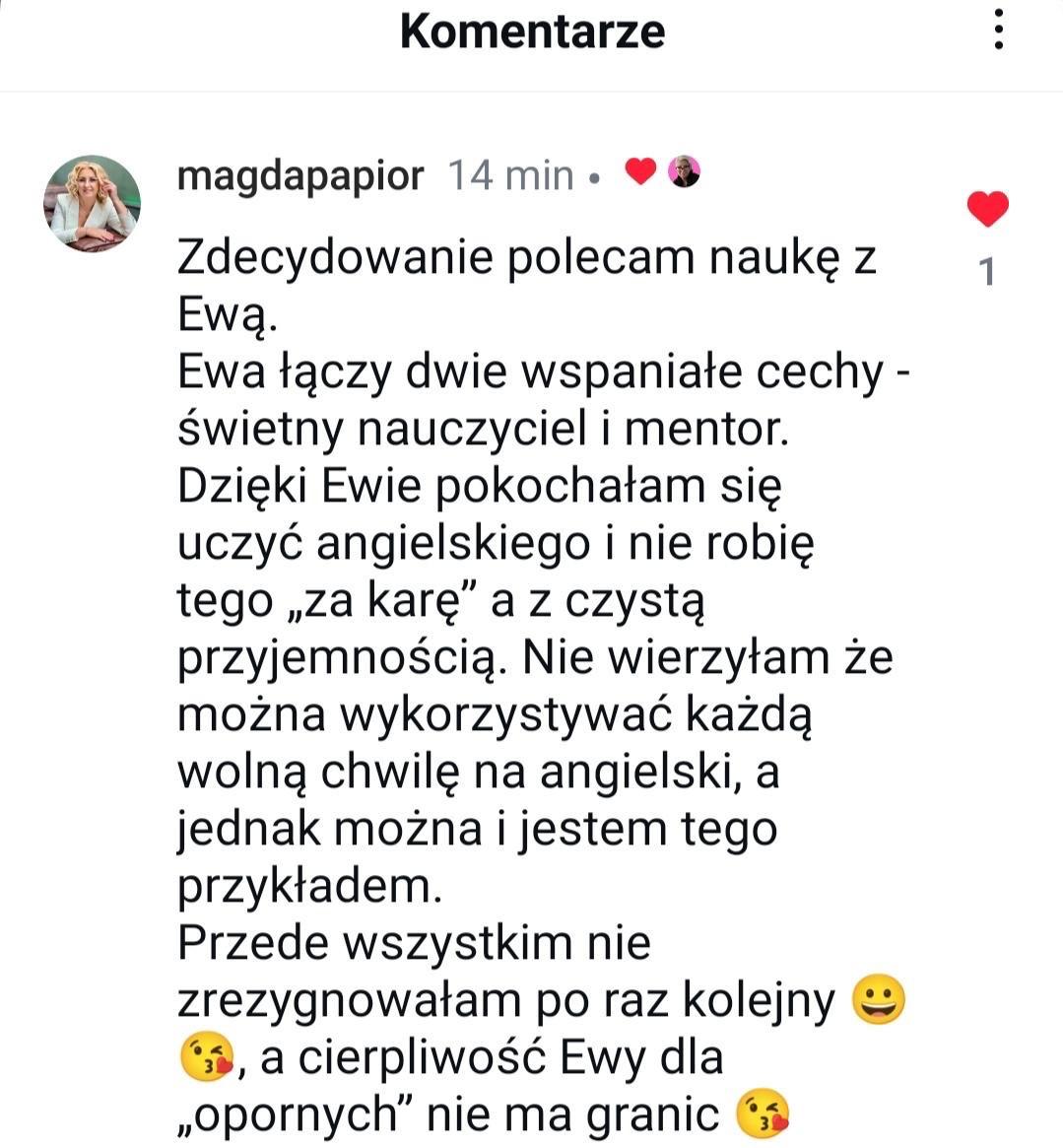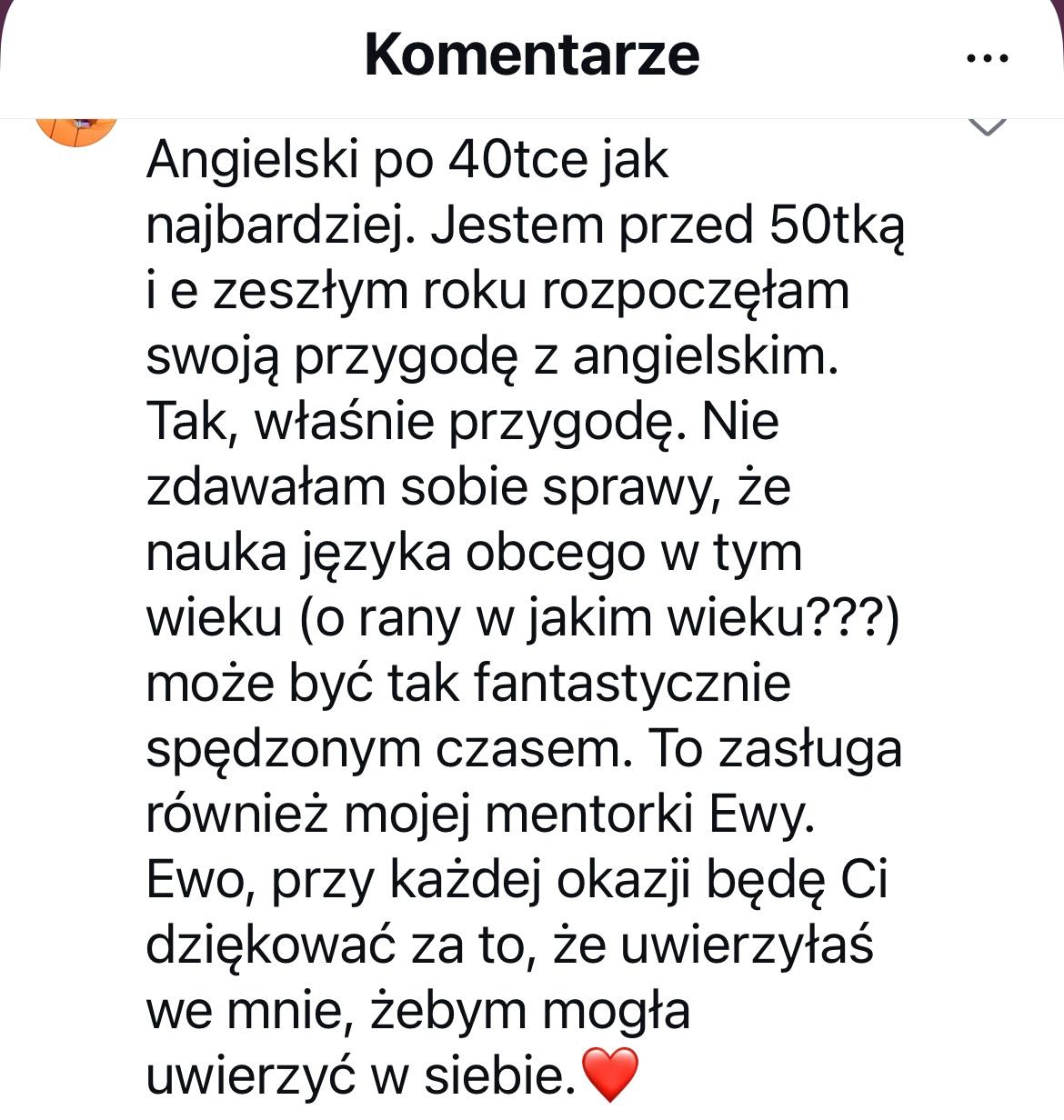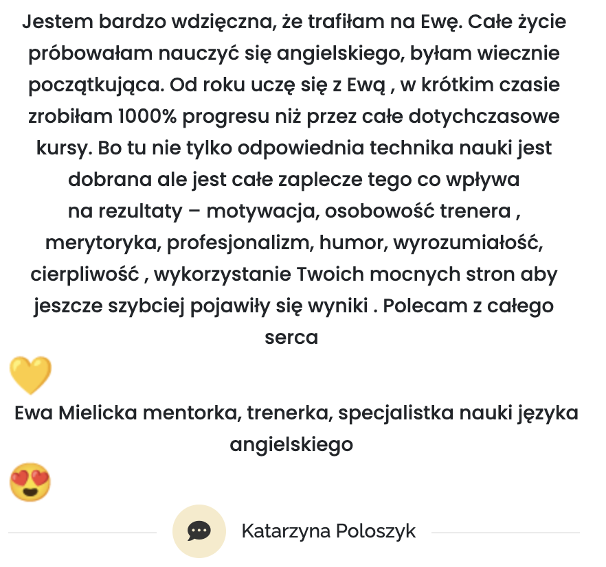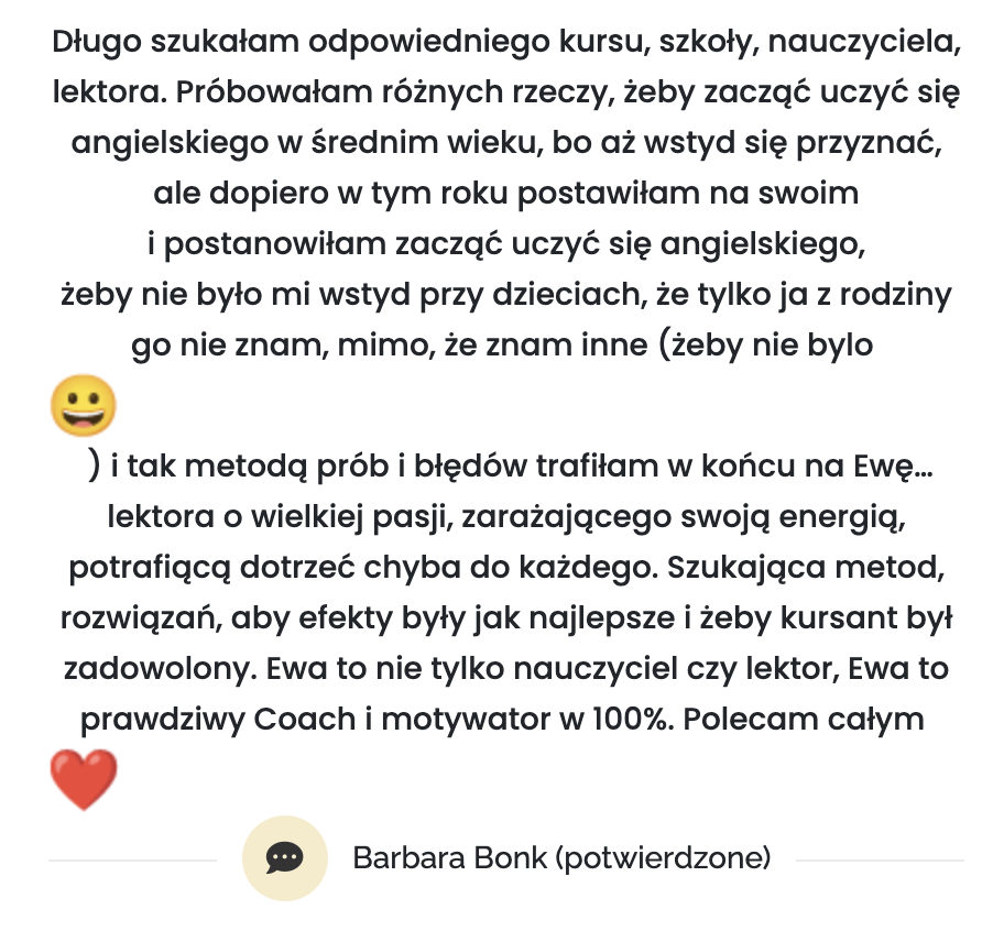 Jeśli tak, zapraszam Cię do kameralnego programu „Nowa tożsamość, nowy angielski” , 6 tygodni pracy, które zmieniają sposób, w jaki myślisz o sobie w języku, a dzięki temu pozwalają zacząć mówić po angielsku spokojniej i pewniej.