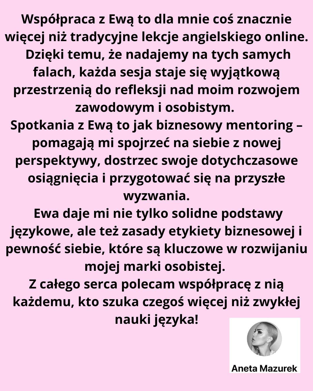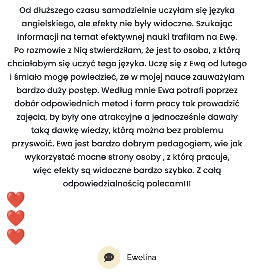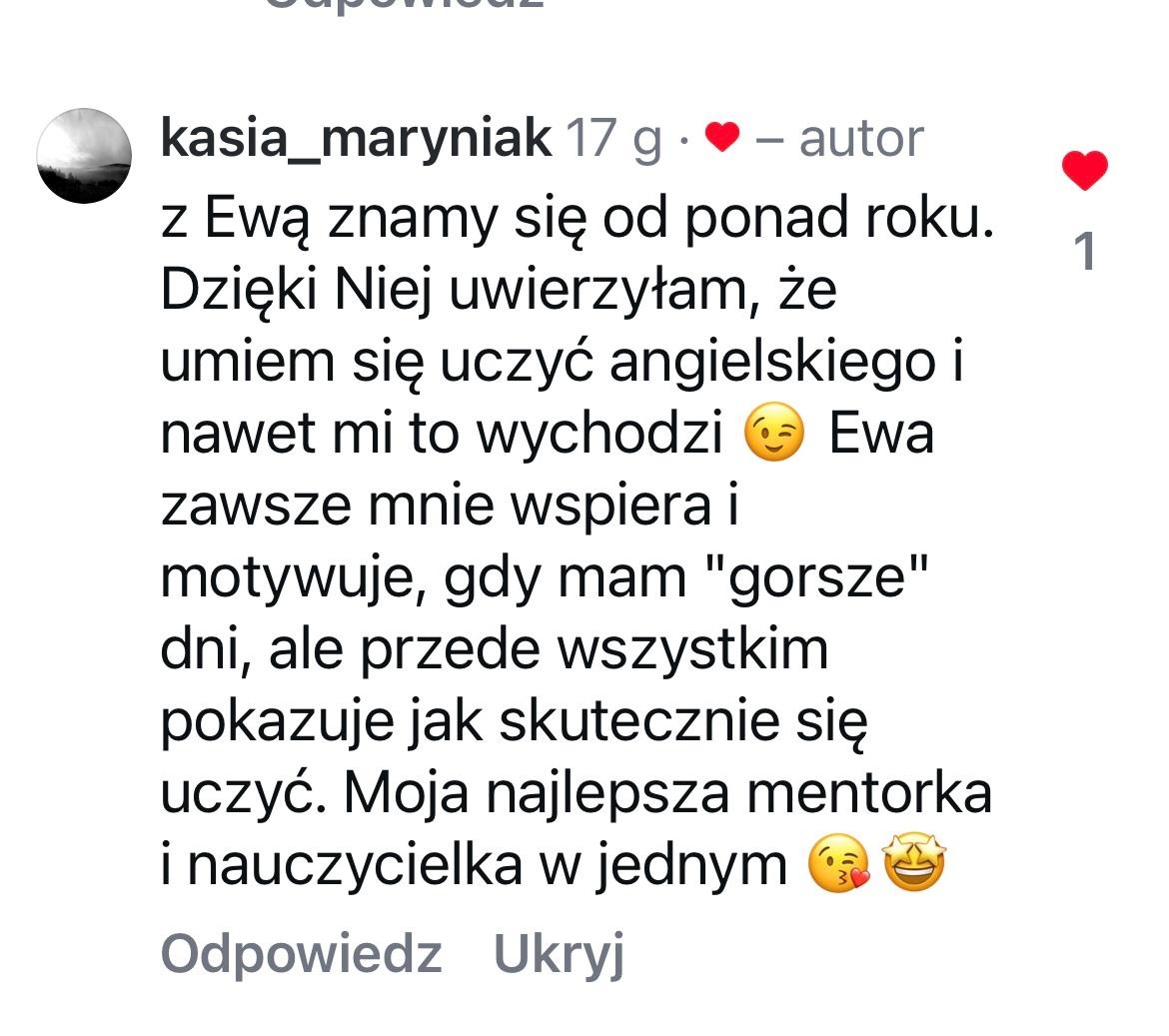 Jeśli tak, zapraszam Cię do kameralnego programu „Nowa tożsamość, nowy angielski” , 6 tygodni pracy, które zmieniają sposób, w jaki myślisz o sobie w języku, a dzięki temu pozwalają zacząć mówić po angielsku spokojniej i pewniej.